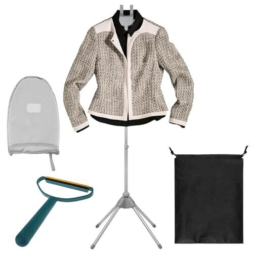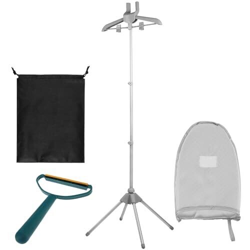 The product is made from aluminum alloy and plastic. The handheld ironing board uses cloth and sponge materials for heat insulation and protection from scalding. It features three adjustable height settings. The stand is foldable and detachable for compact storage and transport, and it Rotates a full 360 degrees for convenient access. Each set includes a clothes steamer stand, a handheld ironing board, a scraper, and a storage bag. A lint scraper is included to assist with fabric care.