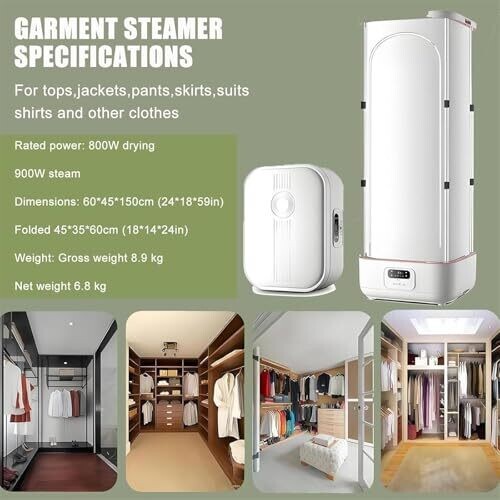 Powerful 900W vertical steam iron offers wrinkle removal and odor elimination. Collapsible design saves space, folding from 60×45×150 cm to 45×35×60 cm. Fast 30-second heat-up with hands-free operation and auto-off. Includes a drying rack for up to 10 kg.