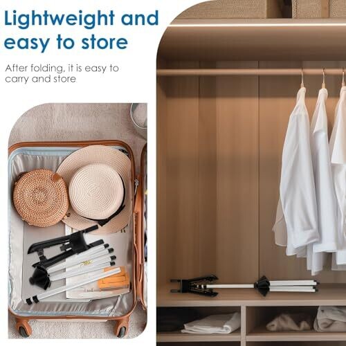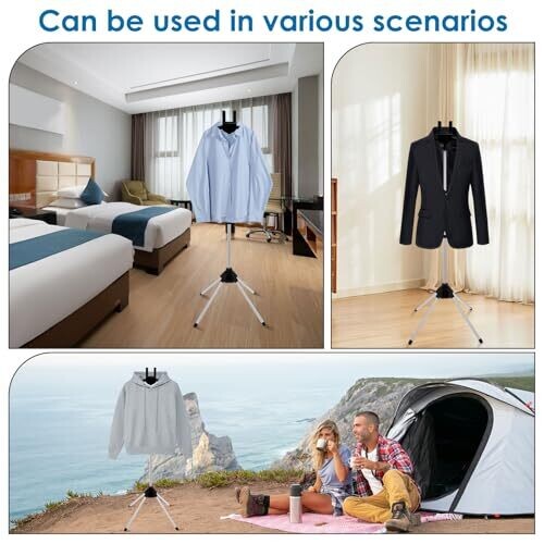 A portable telescopic garment steamer hanger with a rotatable top for multi-angle ironing. It supports shirts, pants, dresses with a sturdy stand, includes anti-scald ironing gloves, compact and folding for easy storage during home or travel use.
