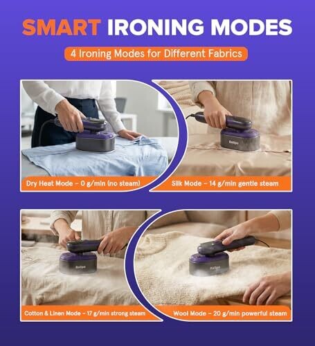 • Four intelligent fabric modes (Dry, Silk, Cotton-Linen, Wool) to tailor heat and steam for safe results.