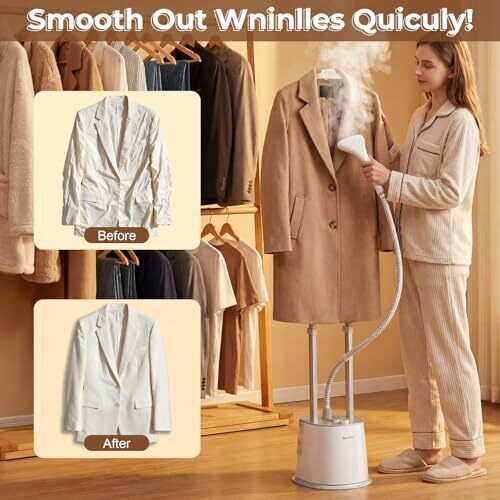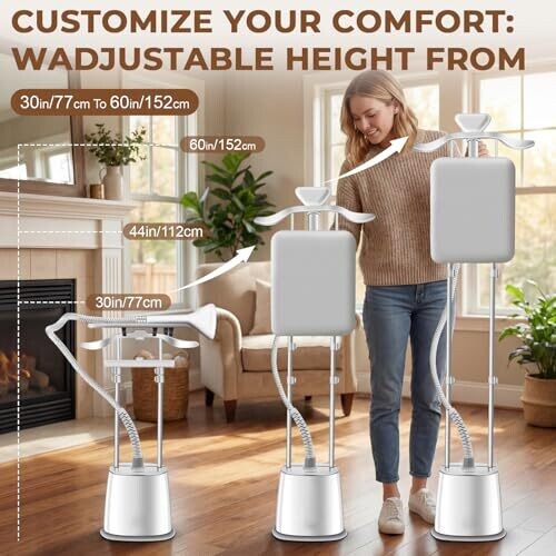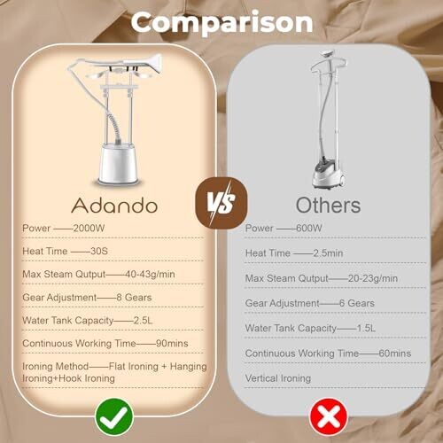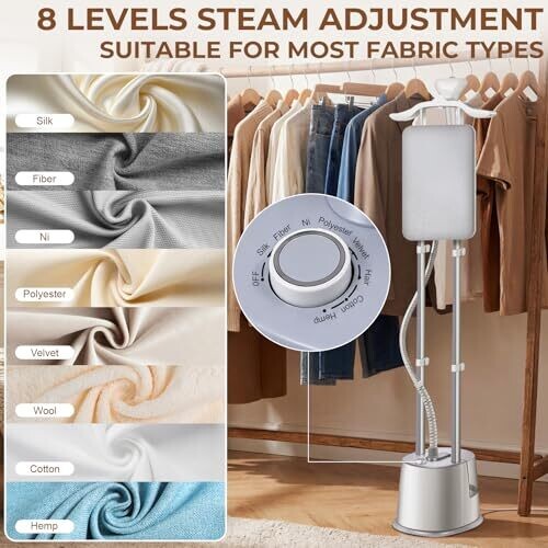 Adando Standing Garment Steamer quickly refreshes suits and dresses with powerful steam. It offers flat and hanging modes, eight adjustable levels, a large 2.5L tank, and safety features like anti-leak protection and auto shut-off for worry-free steaming at home.