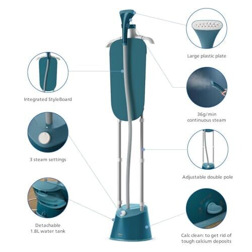 Philips EasyTouch Stand Steamer Iron - 1800W, 5 Steam Settings, Large 1.8L Water Tank, Easy Rinse Descaling, Large Steam Plate, Ocean Blue (STE1040/20)